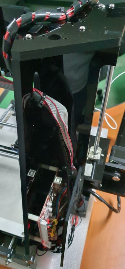 위 사진은 후면에서 우측을 찍은 사진이다. 익스트루더와 노즐에 연결된 배선이 위에서 타고 내려와 컨트롤러에 연결되고 있다. 컨트롤러는 Anet 3D V1.5라는 Anet 전용 보드인 것으로 보이는데 원보드 형태이다.