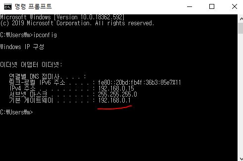 경우에 따라 공유기 주소가 192.168.0.1 이 아닐 수도 있다. 이때는 컴퓨터의 command창을 열어서 ipconfig를 입력하고 자신의 기본 게이트웨이라고 적혀있는 주소를 입력하면 된다